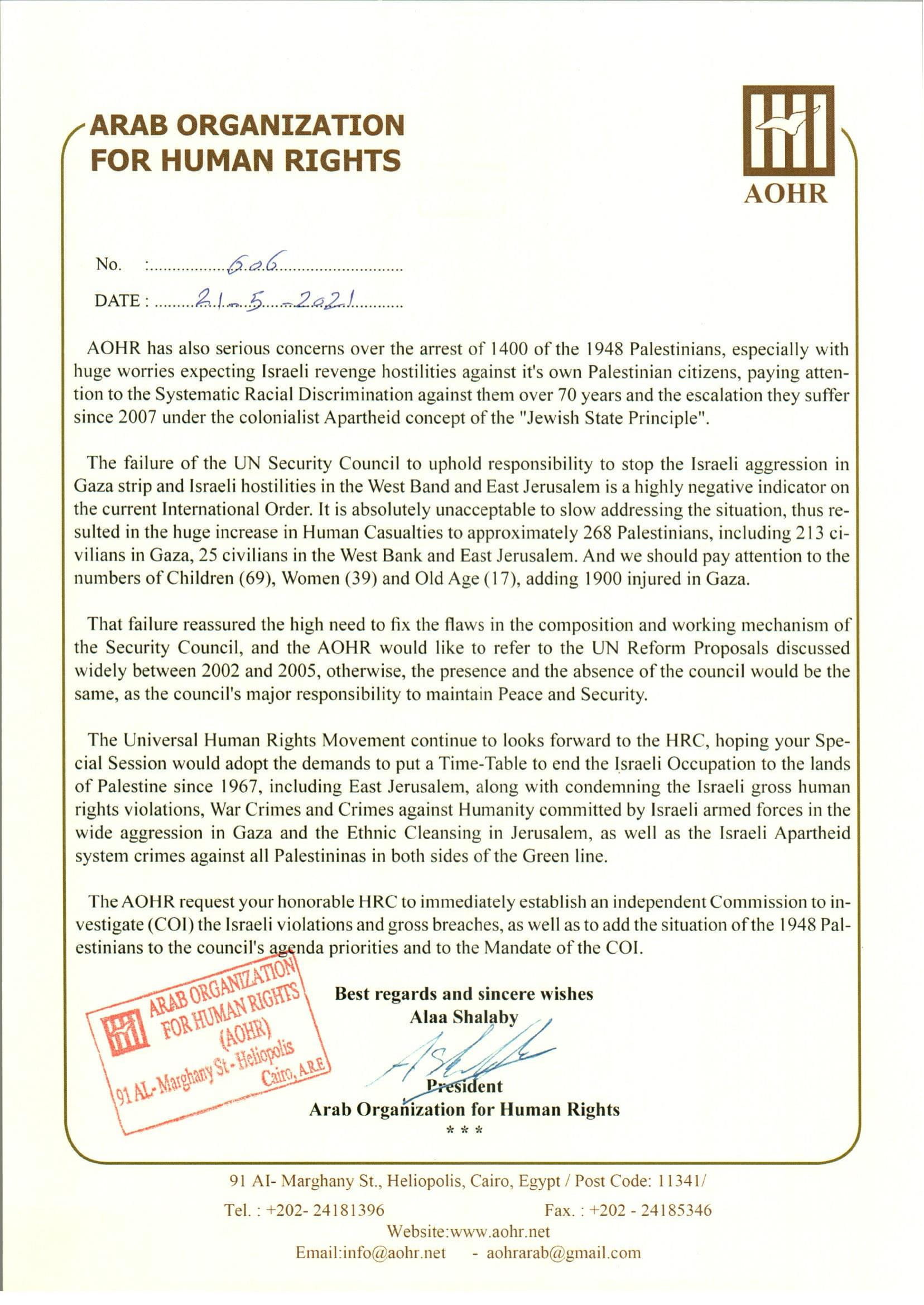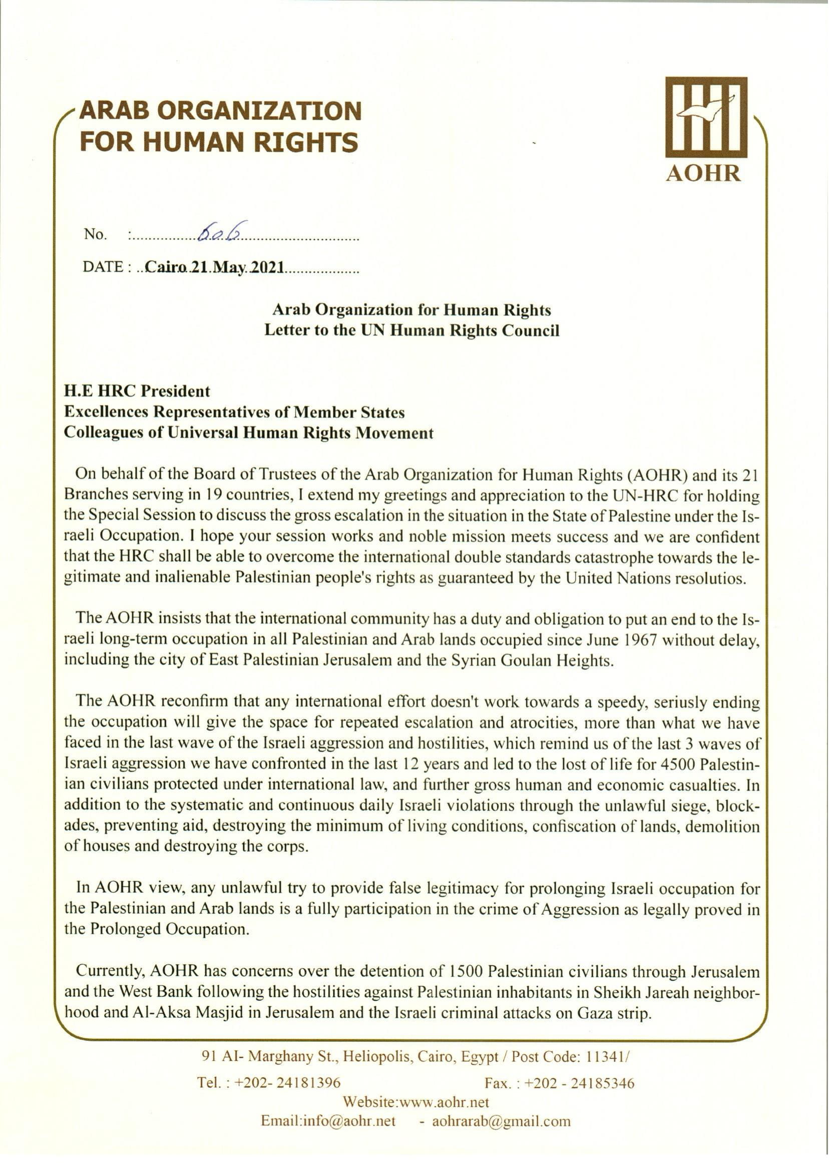 ارسلت المنظمة العربية لحقوق الانسان رسالة حول الاوضاع فى الاراضى الفلسطينية للدورة الطارئة لمجلس حقوق الانسان بالامم المتحدة .