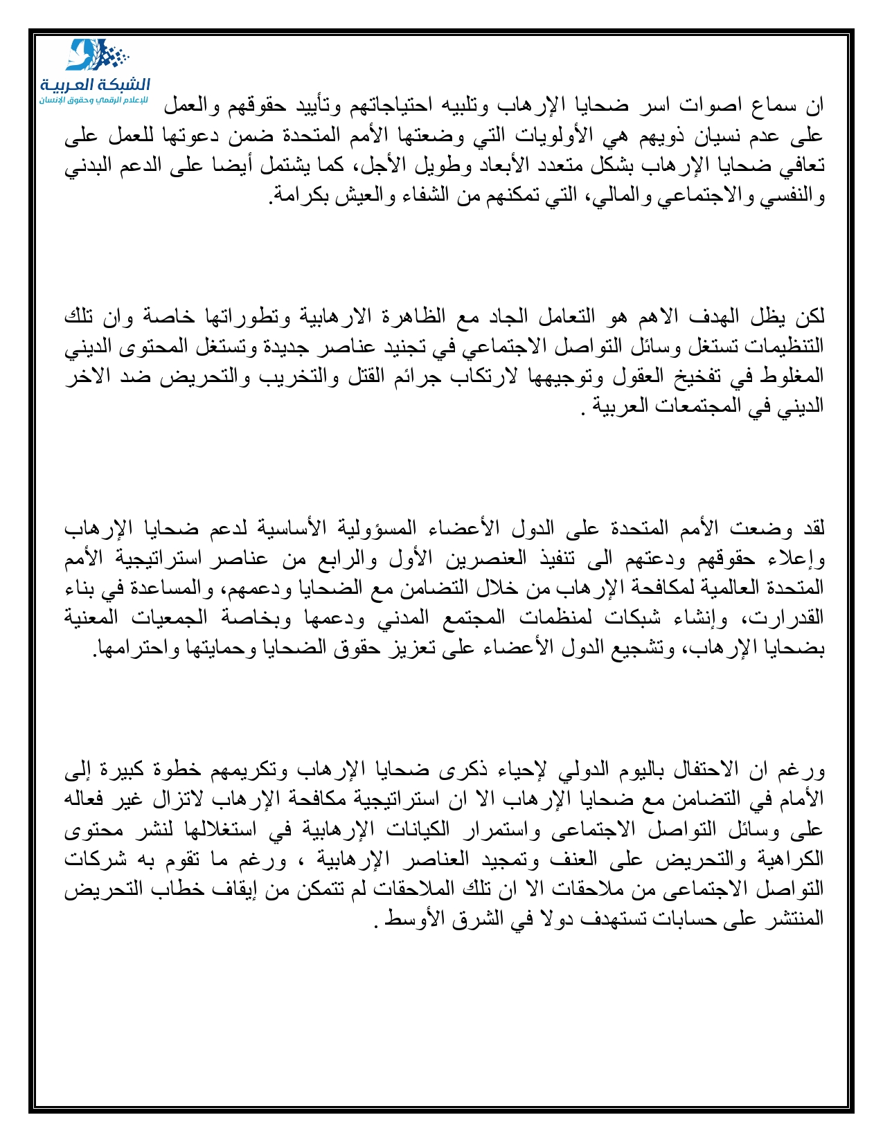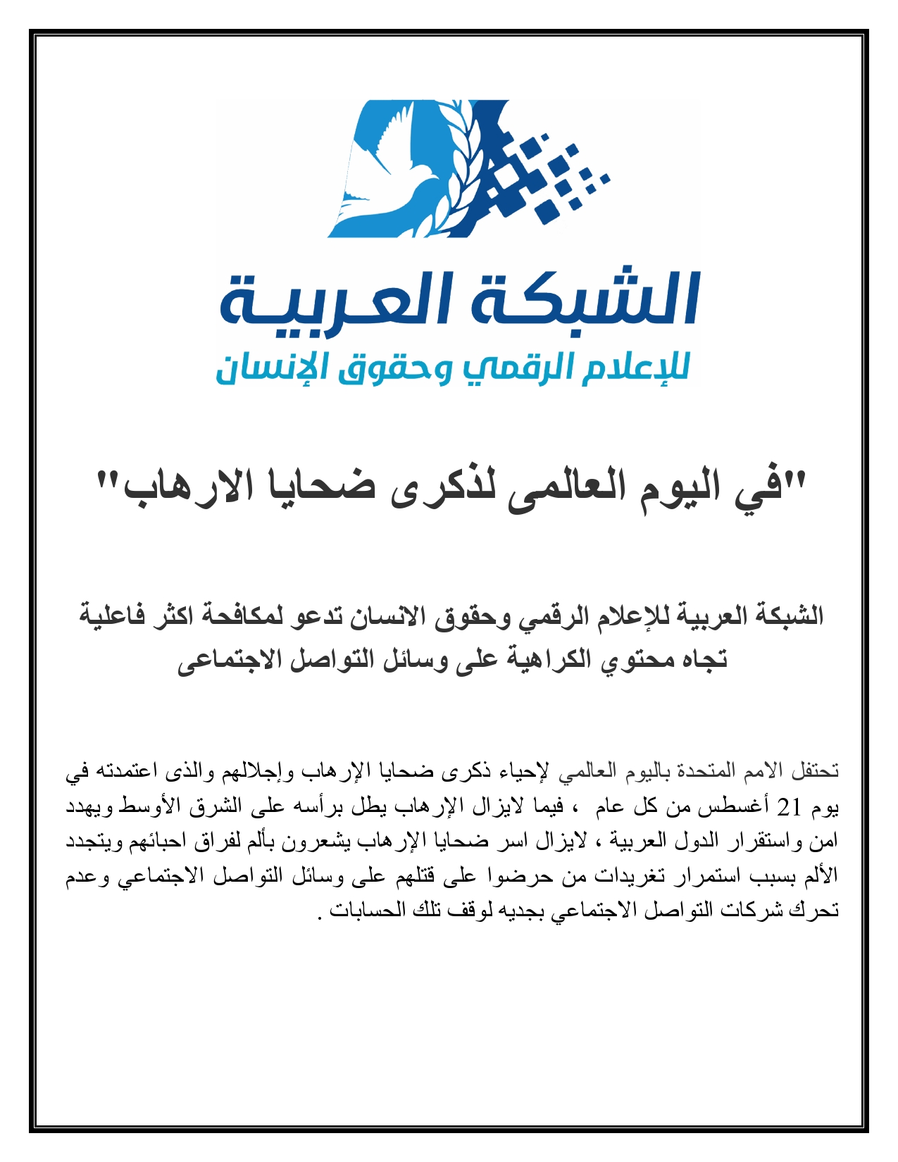 وتدعو الشبكة العربية للإعلام الرقمي وحقوق الانسان المجتمع الدولي في ذكري احياء ضحايا الارهاب الي تطوير التشريعات الدولية لتجريم هذه الظاهرة