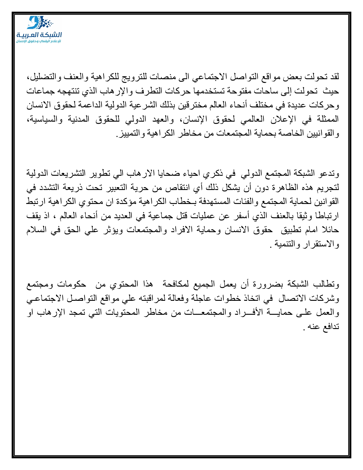 وتطالب الشبكة بضرورة أن يعمل الجميع لمكافحة هذا المحتوي من حكومات ومجتمع وشركات الاتصال في اتخاذ خطوات عاجلة وفعالة لمراقبته علي مواقع التواصـل الاجتماعـي
