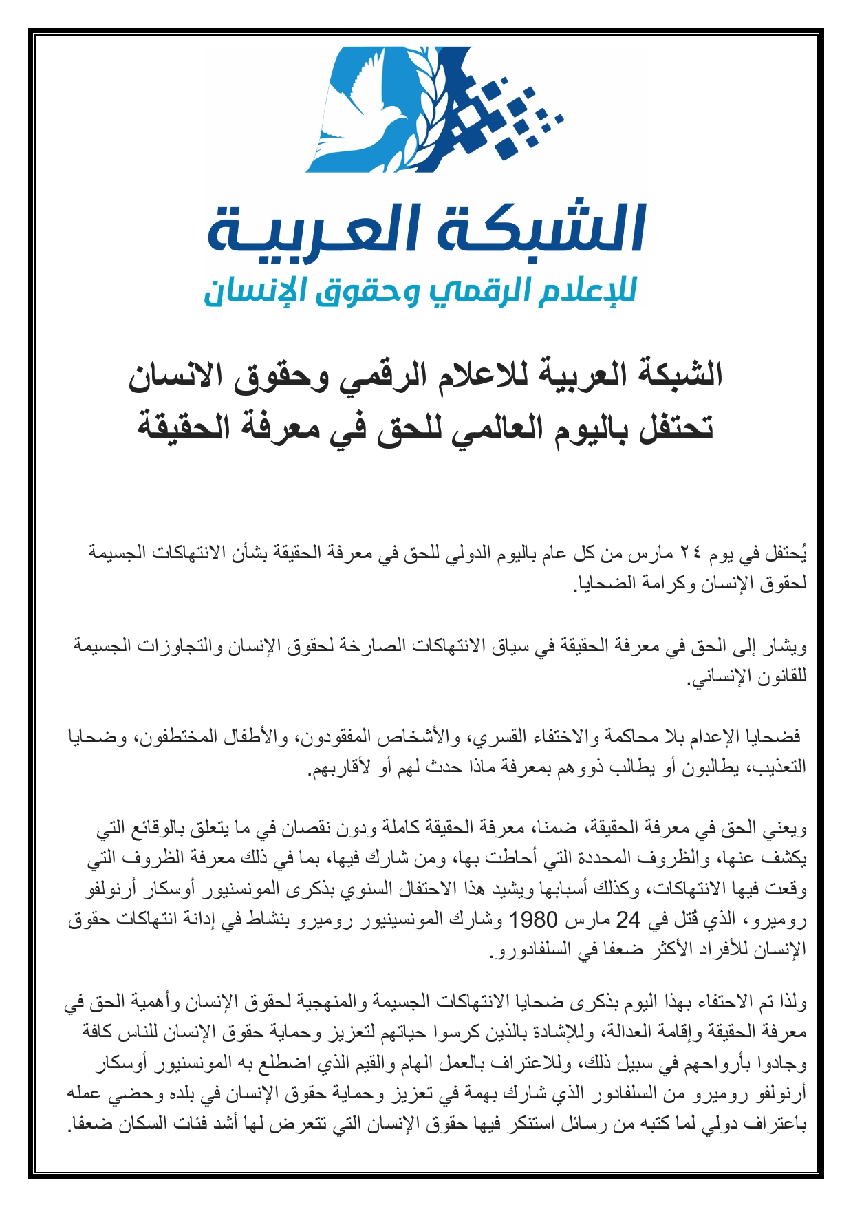 يُحتفل في يوم ٢٤ مارس من كل عام باليوم الدولي للحق في معرفة الحقيقة بشأن الانتهاكات الجسيمة لحقوق الإنسان وكرامة الضحايا.