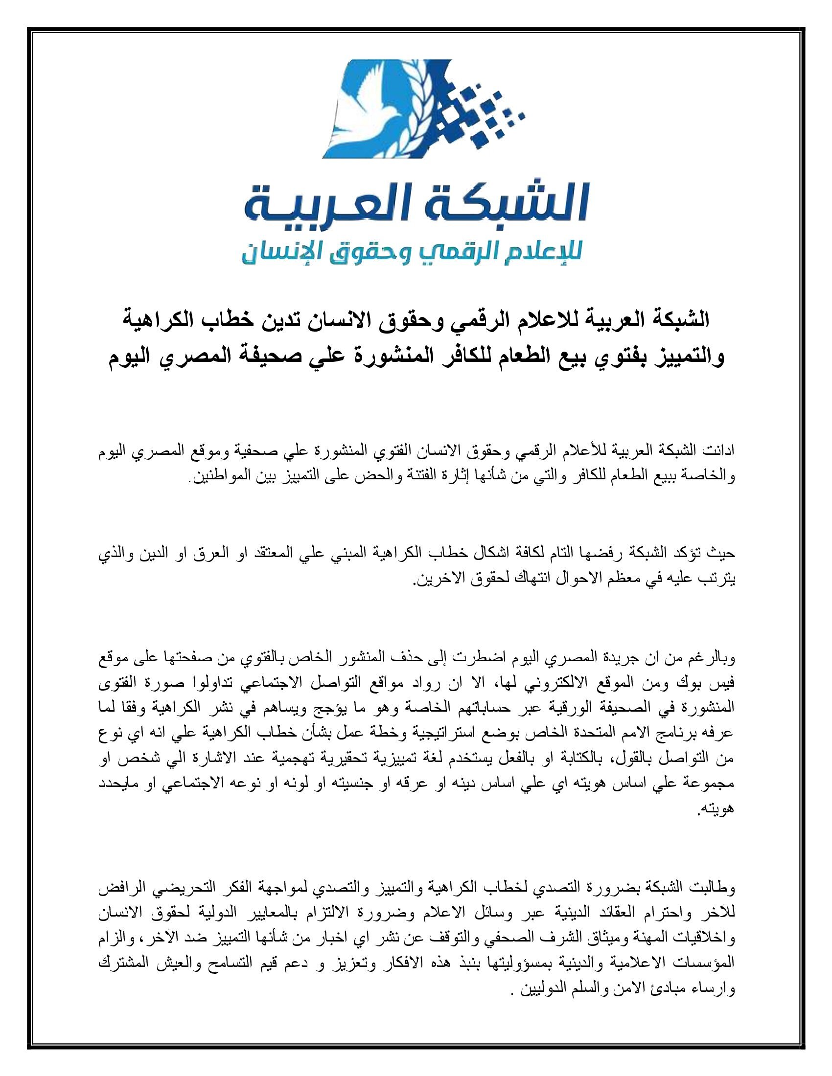 ادانت الشبكة العربية للأعلام الرقمي وحقوق الانسان الفتوي المنشورة علي صحفية وموقع المصري اليوم والخاصة ببيع الطعام للكافر والتي من شأنها إثارة الفتنة والحض على التمييز بين المواطنين.